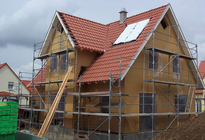 Ein Holzrahmenhaus besticht durch seine hohe Dämmfähigkeit, trotz seines schlanken Wandaufbaus. Holzrahmenbau ist eine trockene und schnelle Bauweise. Häuser in Holzrahmenbau-weise werden vorgefertigt, so dass Ihr Haus auf dem Baugrund-stück in 2 - 3 Tagen aufgerichtet werden kann.
